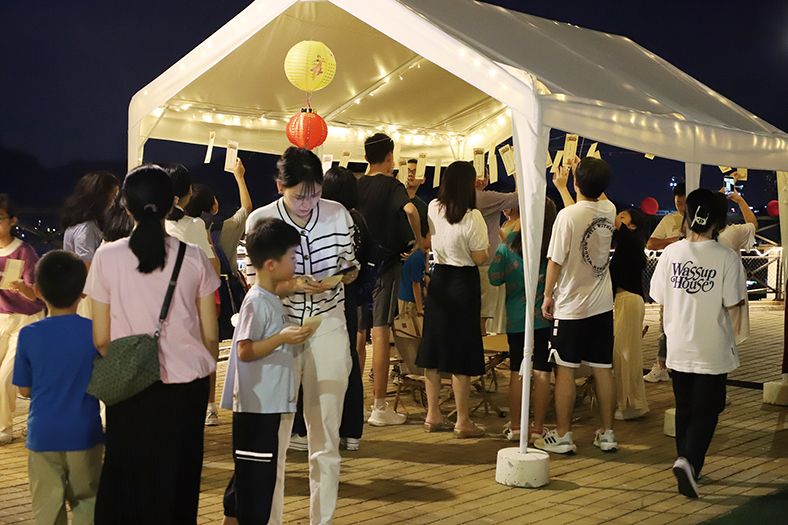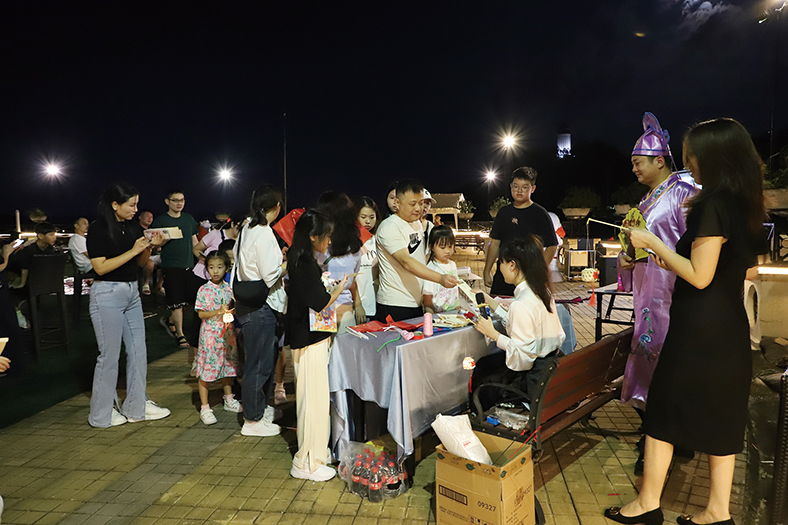 當一輪圓月爬上觀音山頂的時候,客人們陸續來到活動主場——星空吧。星空吧是客人用餐后的必到打卡點,酒店組織了釣魚、博餅游戲、袋鼠跳、三正密盒、快樂套圈、鴻運當投、猜燈謎、誰是歌王等豐富多彩的親子家庭互動節目。